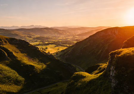Beautiful winding road and hills at sunset in the Peak District - Landscape view with golden light in the UK - Nature and travel concepts, background ready image