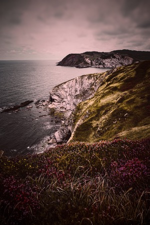 Rugged and craggy coastal cliff path winding along the dramatic seascape with the ocean stretching out below and a moody atmospheric sky overhead