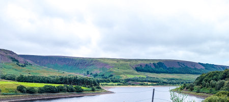 A beautiful view of the Redmires Reservoirs with water lake with green meadows and a cloudy sunny sky
