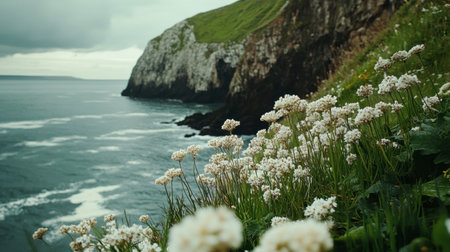 Experience a serene coastal view showcasing dramatic cliffs and blooming wildflowers by the ocean, perfect for nature lovers and travel enthusiasts.