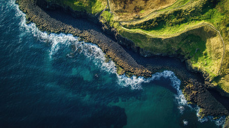 Aerial view of the Giant's Causeway coastline, with the unique basalt columns meeting the churning sea below. No people included.