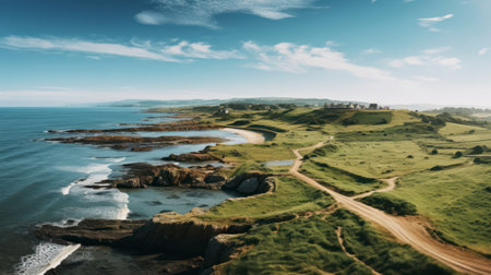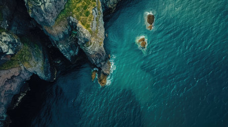 A stunning aerial view of a cliff by the ocean, where the fluid water meets the natural landscape, creating a picturesque and tranquil scene under the open sky AIG50