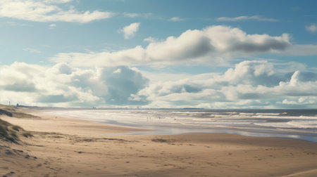 a beach with soft, dreamy landscapes featuring atmospheric clouds and detailed marine views. this commercial imagery captures the essence of a dutch genre scene with its high dynamic range and the use of light cyan and dark beige tones. ai generated