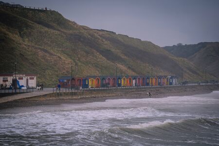 The beach at Saltburn in England showing the tide coming in and the colorful huts