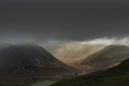 Stunning Autumn Fall landscape image of rain in valley in Lake District creating epic lighting conditions