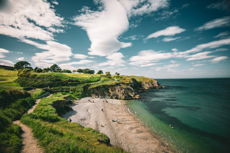 Generative AI : Aerial view of Porthcurno beach along the coastline with cliffs and The Minack Theatre at sunset Cornwall United Kingdom