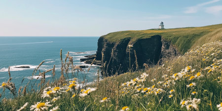 A tranquil coastal cliff with wildflowers blooming, waves crashing below, and a lighthouse standing tall against a clear blue sky. The picturesque setting feels timeless and serene.