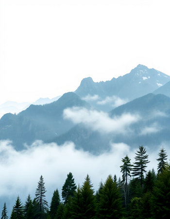 Misty trees rise dramatically in the mountains as morning fog envelops the forest landscape.