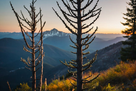 Sunset in the mountains with coniferous trees in the foreground