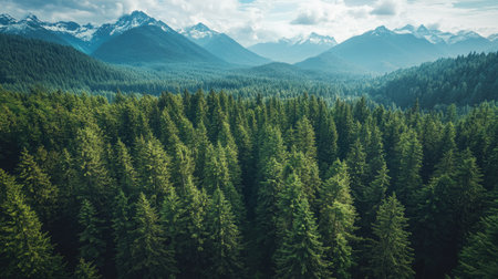 A bird's-eye view of a dense evergreen forest, with snow-capped mountains in the distance and room for copy.