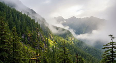 Misty pine forest in mountainous landscape with cloudy sky.