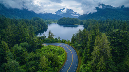 Aerial view of the road in the middle of the forest and mountains