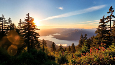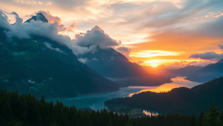 Serene mountain river flowing through evergreen forests at sunrise