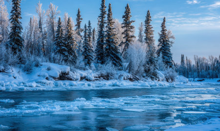 A tranquil river meanders through a misty pine forest, creating a serene atmosphere filled with soft light and lush greenery, perfect for nature lovers.