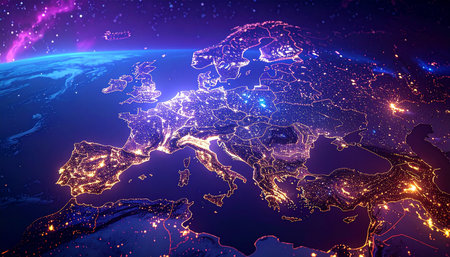 A captivating nighttime view of Europe showcasing illuminated cities and landscapes from space, highlighting the continent's vibrant urban life and connectivity.