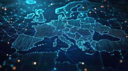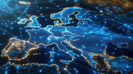 A stunning digital map of Europe showcasing illuminated connections and nodes, symbolizing the flow of information and communication across the continent.