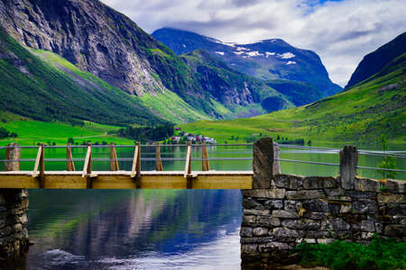 Fjord landscaope with bridge, mountains and green valley with village, Norway