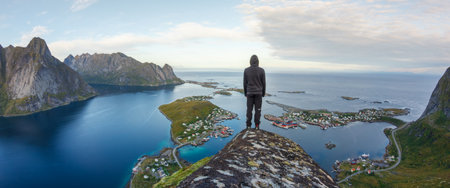 Hiker enjoying the view over Reinefjorden, Lofoten, Norway
