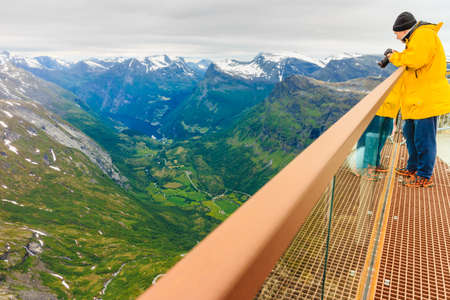 Tourism vacation and travel. Male tourist taking photo with camera, enjoying Geiranger fjord and mountains landscape from Dalsnibba Plateau viewpoint, Norway Scandinavia.