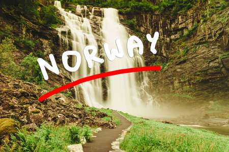Travel, holidays. Norwegian nature landscape. Famous twin waterfall Latefoss or Latefossen, Odda Hordaland County in Norway.