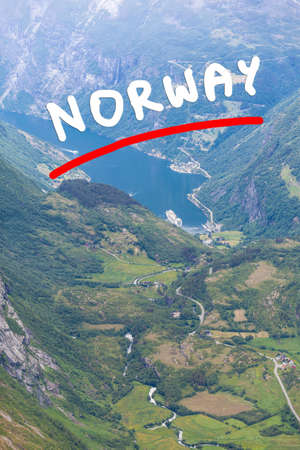 Tourism vacation and travel. Beautiful view over magical Geirangerfjorden from Flydalsjuvet viewpoint, Norway Scandinavia.