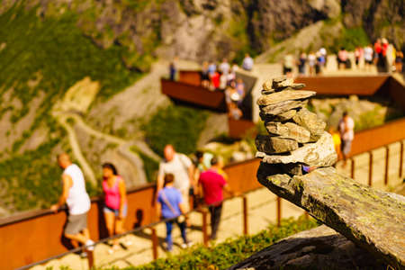 Stone stack and many people tourist on Trollstigen viewpoint in Norway Europe, popular tourist attraction.