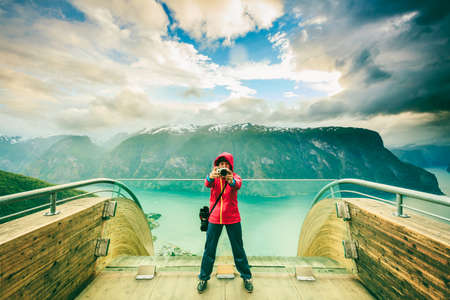 Tourism vacation and travel. Woman tourist taking photo with camera, enjoying Aurland fjord view from Stegastein viewpoint, Norway Scandinavia.