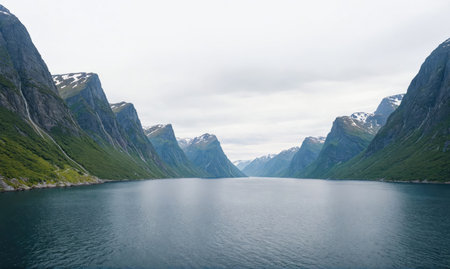 Breathtaking Norwegian Fjord Surrounded by Majestic Misty Peaks and Tranquil Reflective Waterscape