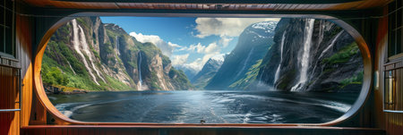 Norway fjord landscape with steep cliffs, waterfalls. Ferry views offer serene scenery for travel agency tours. Calm blue water reflects green mountains. Explore tranquil Norwegian fjords.