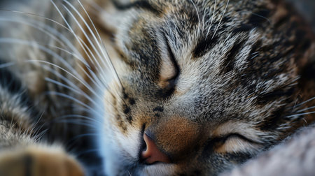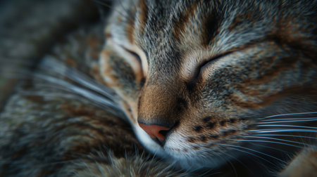 A close-up photograph of a tabby cat peacefully sleeping, showcasing the intricate patterns of its striped fur. the warm lighting highlights the soft textures and delicate features, creating a serene and cozy atmosphere ideal for pet-themed designs. Generative AI