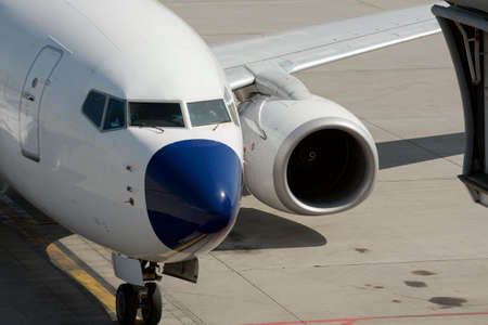 modern airplane parked on airport runway isolated on blue sky background side view of white jet engine passenger