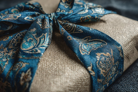 A minimalist kraft wrapped present features a beautifully patterned fabric ribbon, creating a stylish and elegant appearance, ideal for various gifting occasions with copy space