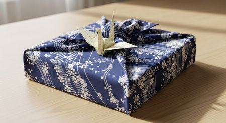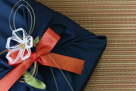 Gift box wrapped with Japanese square of cloth on the tatami.