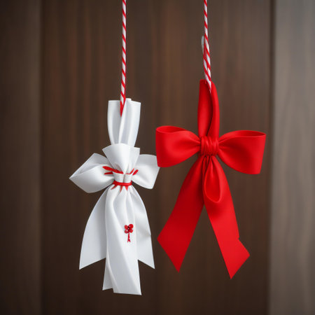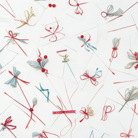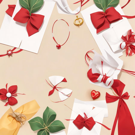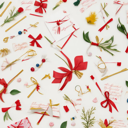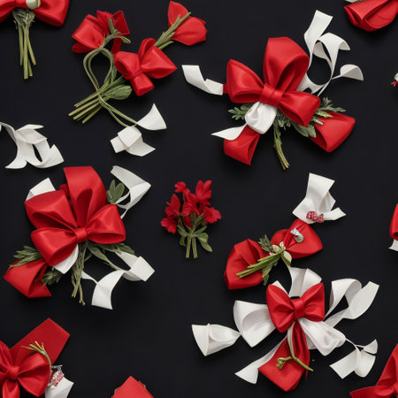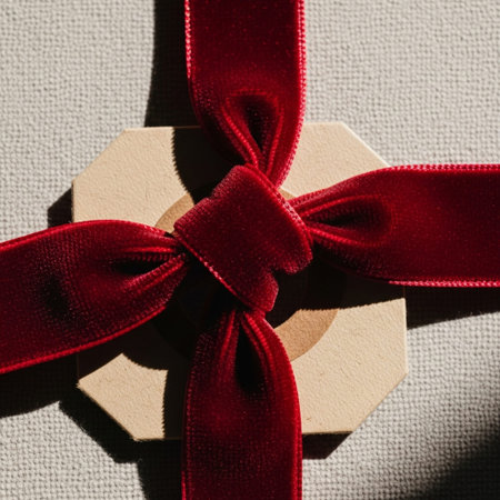 A minimalist composition featuring a red satin bow, perfectly tied and lying flat on a white background, ideal for seasonal themes.