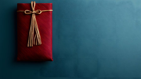 An individual dressed in traditional attire presents a beautifully wrapped gift adorned with flowers and a red ribbon. The setting showcases cultural elements that create an inviting atmosphere.