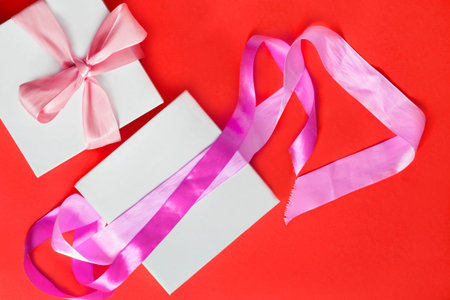 White gift boxes with pink ribbons on red background