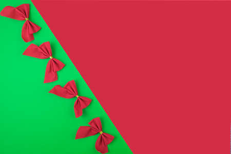 Festive Christmas background with red bows on a green background and free space to add text on a red background. Template for a Christmas card, an invitation to a celebration.