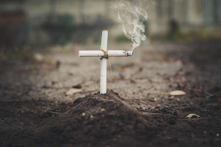 A cigarette tomb. The cross is made of cigarette butts. A Smoking tomb. anti-Smoking concept.
