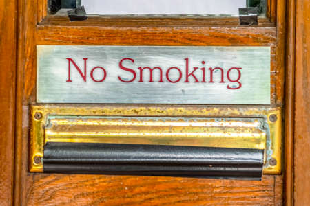 Close up of a grunge rustry No Smoking sign, outdoor infront of a restaurant background, selective focus.