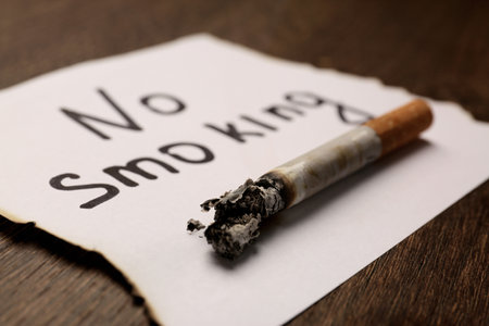 Burnt cigarette and words No Smoking written on paper on wooden table, closeup