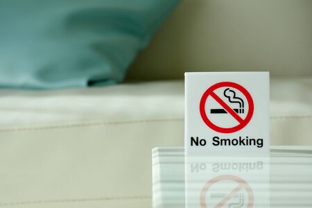 No smoking sign on a shelf of hotel room. Concept photo of banning smoking in public area, medical, health, free smoking, hazard and addiction.
