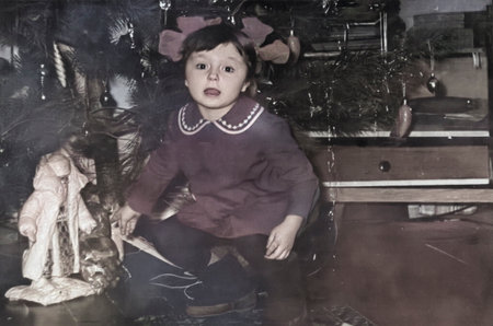 Vintage portrait of a cute little girl by the Christmas tree. Retro photo from 1972.