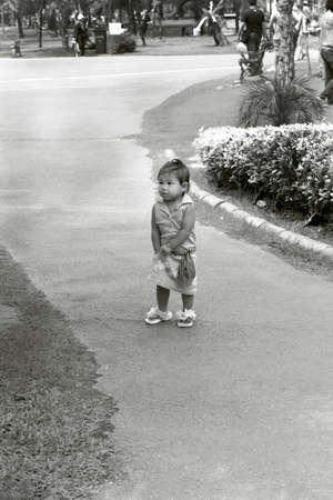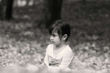 Portrait, Little asian girl was smiling and playing happily in the park, Black and white, monochrome