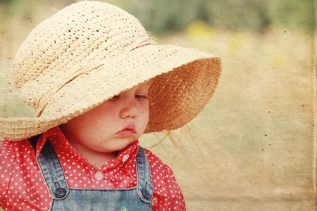 beautiful girl in the hat on the meadow in old image style.