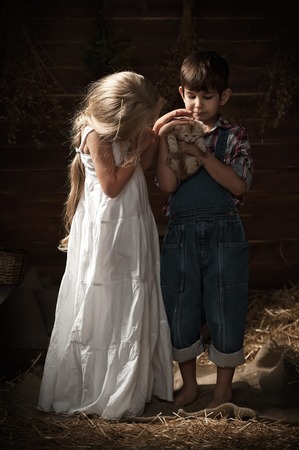 Little boy with a girl playing with a kitten in the barn