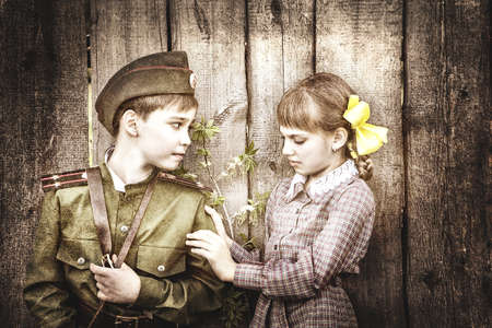Postcard, stylized as vintage for the Victory Day. A boy in a military uniform and a girl in an old dress. The theme of May 9, Victory Day in Russia. Soft selective focus, added noise.