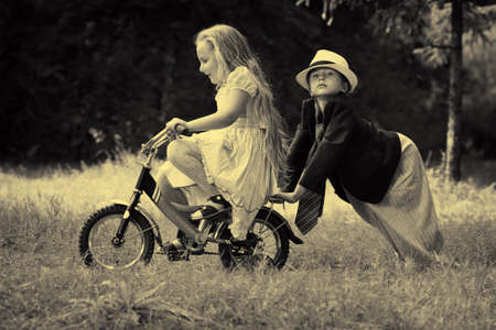 Cute children is riding a bike in a summer park. Retro style.