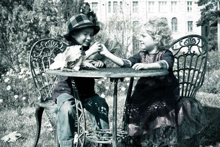 Cute children having a rest at a park. Retro style.