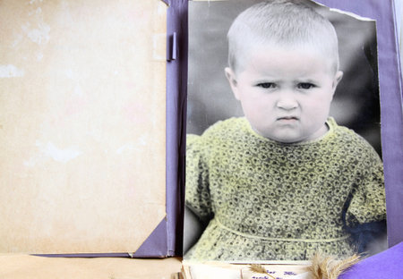 Man holds a childhood picture of the sixties in his hand Strong vignetting and blurred edges to increase the memory effect