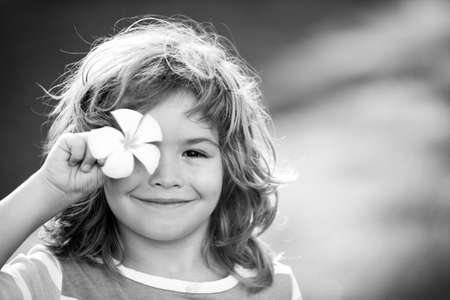 Close up portrait of a small blond boy eyes plumeria flower. Funny kids in summer nature park. Summer vacation. Covers eyes with flower concept.